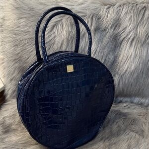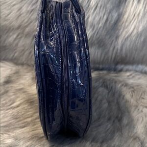 This stylish navy blue handbag features a chic croc-embossed design. Perfect for adding a touch of elegance to any outfit. Two zippers on the interior & exterior, in good vintage condition.