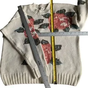 Mexx 100% cotton jacquard-knit sweater featuring oversized floral motifs. Ribbed neckline, cuffs, and hem. Drop shoulder, boxy fit to waist Soft, cozy, and beautifully detailed, perfect for vintage-inspired looks. Pink, peach, green and blue on a cream base. Relaxed fit Size Small/Medium(see measures for preferred fit). Great/excellent Used Condition GUC.