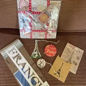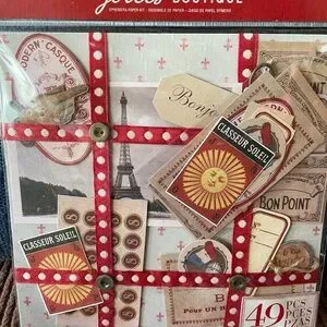 This colorful Jolee Boutique 49 piece assortment features a collection of notions, ribbons, photos, papers and dimensional embellishments inspired by Paris - perfect for junk journals, scrapbooks, framed collages, etc. Also included are additional Paris-themed stickers, tags and papers (see pics). The kit has never been been opened, and the additional pieces are all in great shape.
