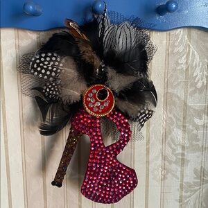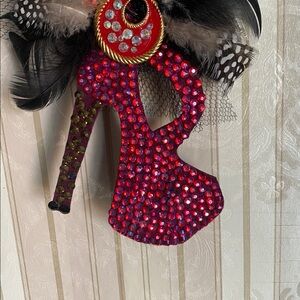 Eye-catching red rhinestone high heel brooch with dramatic black and brown feather accents. Sparkling crystals add glamor and the feathered detail creates bold texture. Perfect for adding a statement touch to jackets, bags, or scarves.