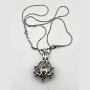 A beautiful lotus flower cremation urn necklace crafted in stainless steel. The openwork lotus design features graceful petals surrounding a central compartment that opens to hold a small amount of cremains, dried flowers, or other meaningful keepsake.