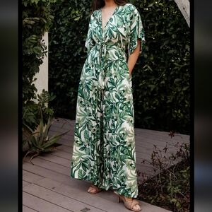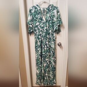Flowy wide-leg jumpsuit with tropical leaf print. V-neck with tie-front detail. Short flutter sleeves and side pockets. Lightweight and breezy for warm days.