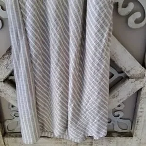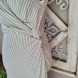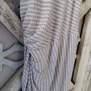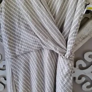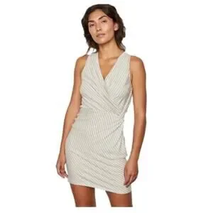 Grab this linen striped size small sleeveless faux wrap surplice ruched Tiva mini dress now.