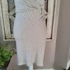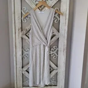 Linen and white striped sleeveless faux wrap surplice Tiva mini dress with side ruching by Bailey 44 in a size small.