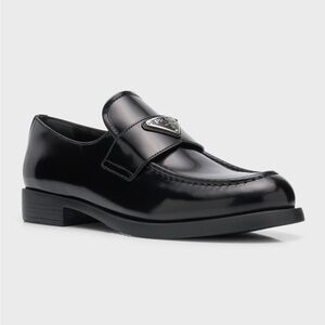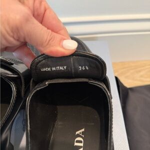 Like New, Comes with Box and shoe bags. Elegant black loafers with a glossy finish. Features iconic Prada logo. Ideal for formal and casual wear. Classic style. Size 36.5