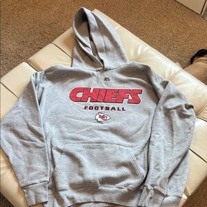 Comfortable NFL Chiefs hoodie. Features bold red logo. Soft gray fabric. Perfect for fans.