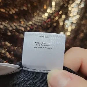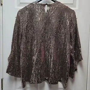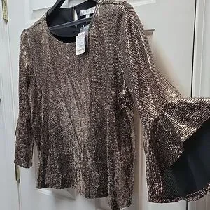 This Kasper plus size 2X gold & black blouse is a stylish and festive piece perfect for holiday parties or formal events. This metallic top features a round neck with a keyhole detail, 3/4 bell sleeves, and a button closure. Made from polyester chiffon, it has a metallic gold color, adding a touch of sparkle to your outfit.