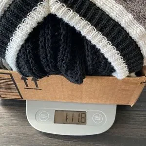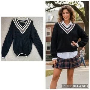 Bold contrast v-neckline. Dropped shoulders. Open knit. Oversized. White trim.