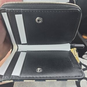 Marc Jacobs striped card wallet. Navy and cream canvas with embroidered "THE WALLET" logo. Compact card slots and stitched trim. Stylish and casual accessory.