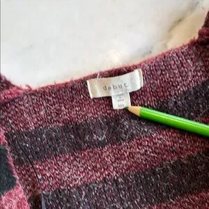 Cozy open-front cardigan by debut. Maroon base with black Aztec-inspired patterns. Light blue diamond motifs on front. Long sleeves and relaxed fit. Soft knit fabric for layering.