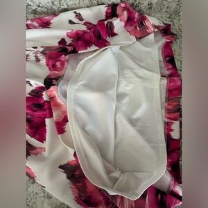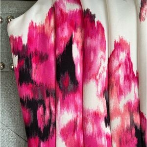 Beautiful pinks, black and white background. Stretchy and extremely comfy. Hits at the knee and is fully lined.
