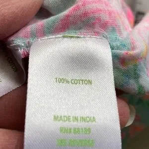 Bright floral print in green and hot pink. Flutter sleeves and a tiered skirt. Lightweight, breezy fabric. Vibrant, summery look.