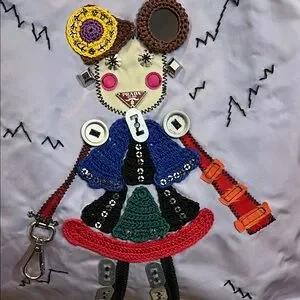 Authentic Prada kids accessory featuring a playful crocheted doll appliqué. Eye-catching pink, blue and red accents add fun character. High-quality designer detailing perfect for stylish children's wear. Adds a whimsical designer touch to outfits.