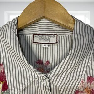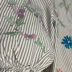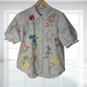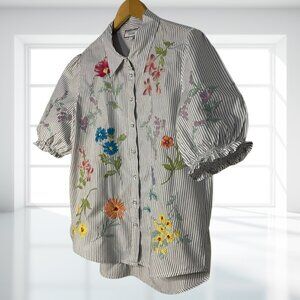 Key Features: Embroidered florals, vertical stripe print, smocked cuff sleeves, relaxed fit, high-quality cotton. A versatile top that pairs perfectly with denim, trousers, or skirts. Don't miss out on this classic Johnny Was piece!