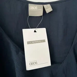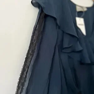 New with tags. I’m like new condition. Navy in colour with black lace accents. Sweetest ruffle trim adds the cutest flare. V-neck. Has a tie that could be tied in the back or front to show off your bump!