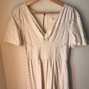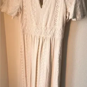 Lightweight cream eyelet maxi dress by Anthropologie. V-neckline with short sleeves. Delicate all-over eyelet embroidery. Flowy A-line skirt for easy movement. Versatile piece for daytime or events.
