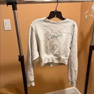 Cozy gray cropped sweatshirt. Features embroidered logo on front. Perfect for casual wear.