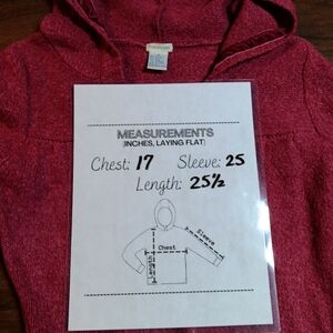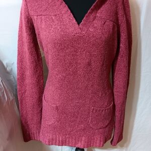Soft hooded pullover sweater in rose red. Features a V-neckline with velvet trim strip inside edge of hood, long sleeves, and two front patch pockets for everyday comfort. Lightweight knit that layers easily and keeps you warm. Timeless, casual style perfect for daily wear. Note: This is a medium but is a slim fit. Pre-owned in good condition.
