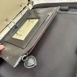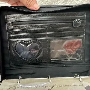Brighton leather binder in black. Croc-embossed accent panel adds texture. Decorative heart shaped silver-tone detail. Sleek, professional style for documents and notes, calendar refills - usually available on Amazon, for example.