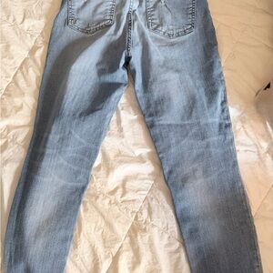 Stylish distressed women's jeans in a light blue shade. Perfect for a casual, trendy look. Ankle length. Small ink stain see pic