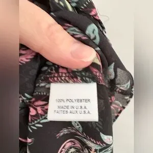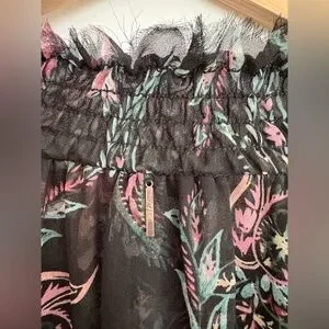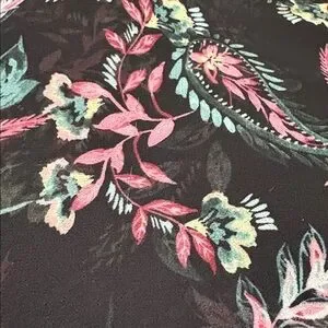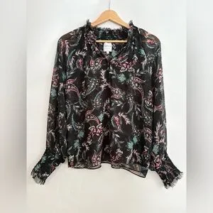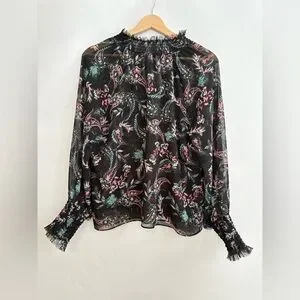Stunning v-neck blouse with cinched wrists and raw hem on neckline and wrists. Beautiful paisley print. Size XS. About 20.75 inches from pit to pit laying flat. About 22.5 inches long. Excellent condition.