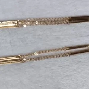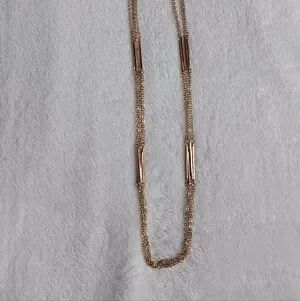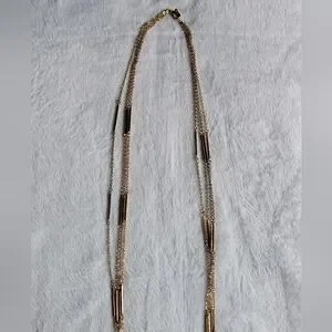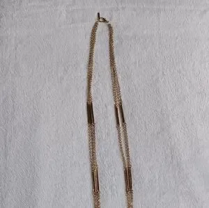 Chic gold-tone necklace with layered strands. Features sleek bar accents. Ideal for elevating any look.