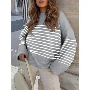 Women's Grey White Stripe Oversized Long Sleeve Casual Fuzzy Knit Sweaters