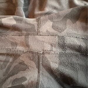 Black camo print, high-waisted leggings. Perfect for workouts or casual wear. Some pilling between legs. (Noted in pictures).