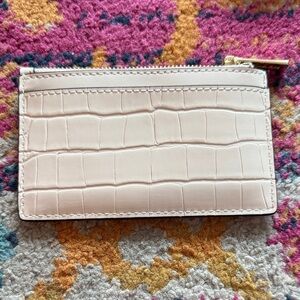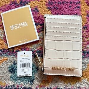 Stylish Michael Kors card holder in cream with a crocodile pattern. Features gold-tone logo detail. Perfect for organizing essentials.