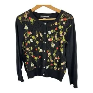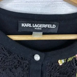 Karl Lagerfeld Lace Embroidered Pearl Button Up Cardigan Sweater Size Large