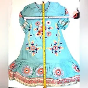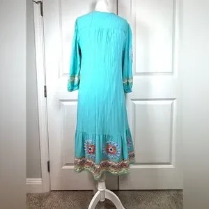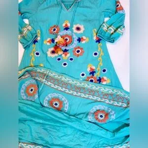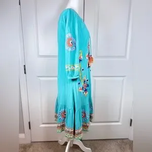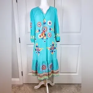 Soft Surroundings artisan embroidered boho tunic dress in a vibrant turquoise color with intricate multicolor floral embroidery and tassel tie neckline. This relaxed bohemian silhouette is lightweight, flowy, and perfect for resort wear, vacation, cruise, or summer styling.