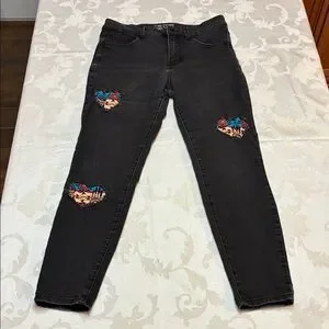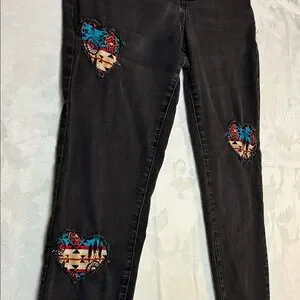 Black skinny jeans by Maurices. Features three hand sewn heart patches with colorful prints. Sleek slim silhouette for everyday wear. Vibrant patchwork adds playful contrast. One of a kind look!!! Size 10. Waist 31 inches. Inseam 29 inches. 69% cotton, 29% polyester, & 2% spandex. Extremely comfortable! Ships from the USA.