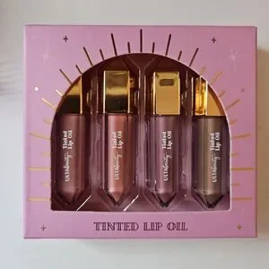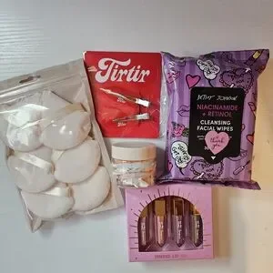 Pink cosmetic bag, includes betsey johnson cleansing wipes, whipped body polish, tinted lip oil set, tir tir hair clips, and powder puffs.