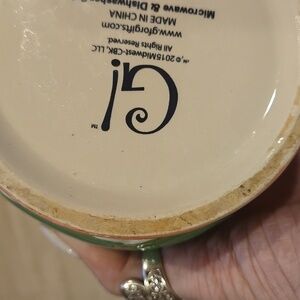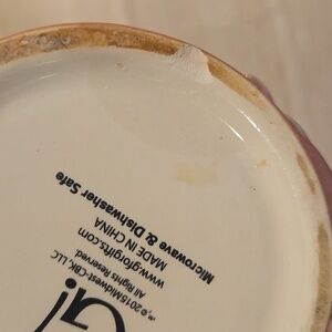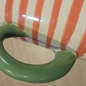 Such a unique and bsolutely adorable mug! The pictures look more orange but the mug is pink and white striped. Microwave and dishwasher safe. In great condition except for some wear on the bottom...see pics.