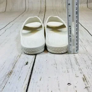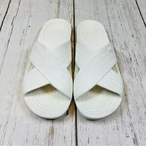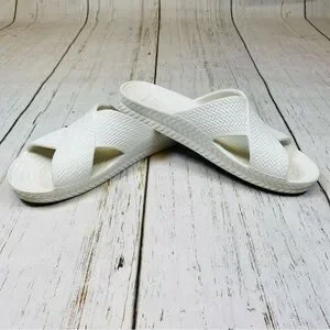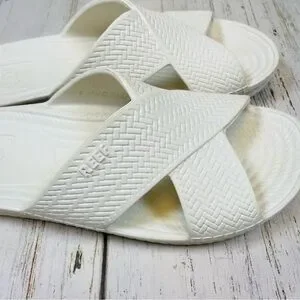 Size 9. Reef Water X Cross Slide Sandals in White. Elevate your pool game with these pretty slides that take you from beach to brunch in waterproof style. Soft, comfy, and very versatile, for the adventure that's your life. Injection Molded Waterproof EVA straps with espadrille rope inspired texture details sugarcane EVA. Single density, injection molded sugarcane EVA footbed, provides the perfect blend of cushion and durability with hints of espadrille details throughout the footbed. All measurements are approximate.