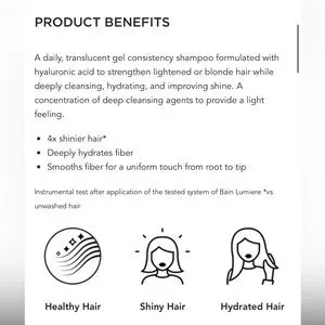 A daily, translucent gel consistency shampoo formulated with hyaluronic acid to strengthen lightened or blonde hair while deeply cleansing, hydrating, and improving shine. A concentration of deep cleansing agents to provide a light feeling.
