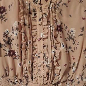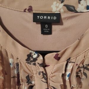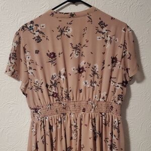 Blush pink floral dress by torrid. Torrid Size 0 (aka L/XL) Front ruffle placket and short sleeves. Smocked waist for a fitted silhouette. Soft, flowy fabric with delicate floral print.