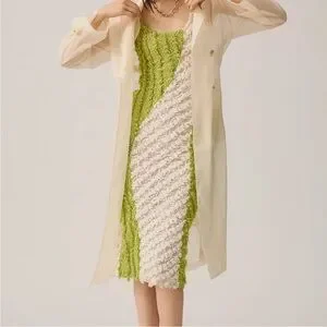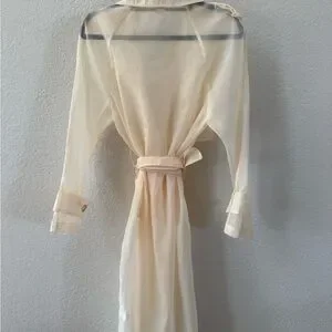 Sheer lightweight trench with classic lapels. Double-breasted front with belted waist. Long sleeves with cuff details. Soft flowing fabric for an elegant drape.
