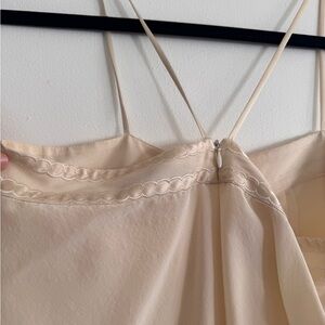Elegant cream silk mini dress. Features pleated front and delicate strap design. Stunning chic embroidered detailing. Perfect for any occasion, but super sexy with biker boots and an edgy jacket.