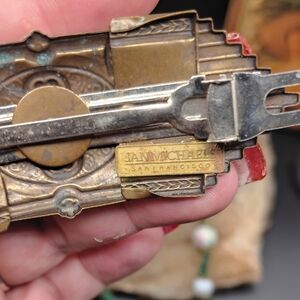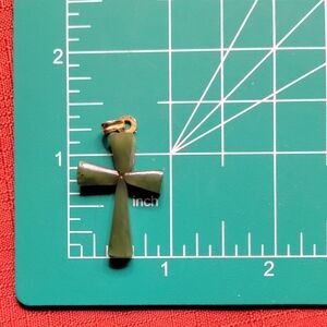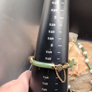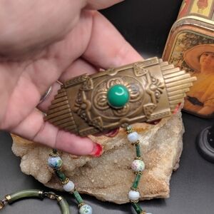 Charming necklace set with green and gold accents. Features intricate beadwork. Cross pendant, gold tone setting, Jan Micheals San Francisco hair barrete and gold tone jade bracelet with safety chain. some wear on safety chain.