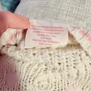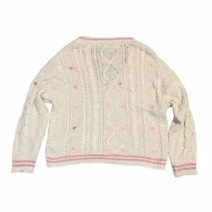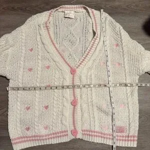 White cardigan with pink embroidered hearts all over and heart shaped buttons along the front