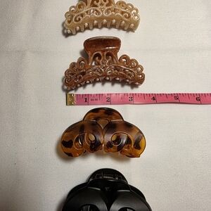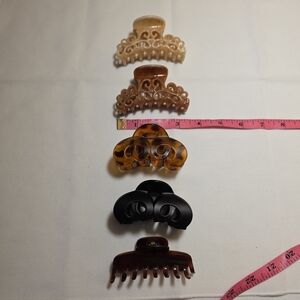 Stylish set of 5 hair claw clips. Features neutral tones including cream, brown, tortoiseshell, and black. Perfect for versatile styling.