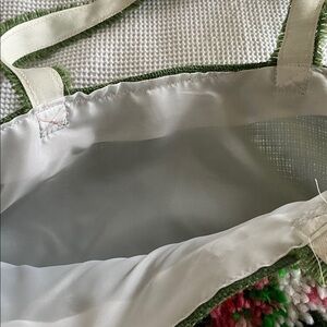Collaboration between me and my mom, vintage hook rug has been added to a green burlap handmade tote bag. Not perfectly sewn, some imperfections, but would be lovely for grocery shopping with a wipable polyester lining. I used it for a while, but happy to pass it on to someone who loves a grandma core vibe!