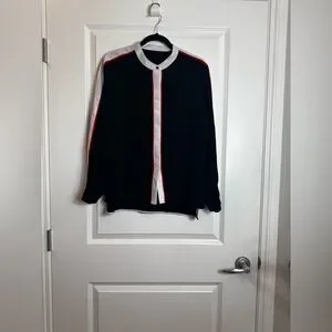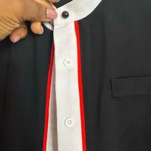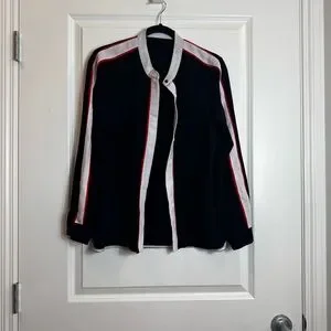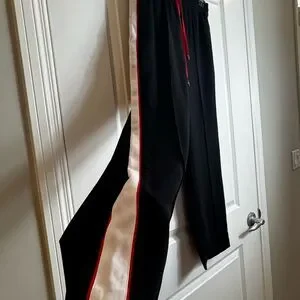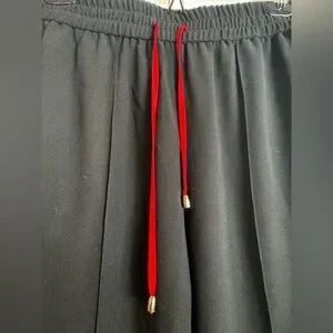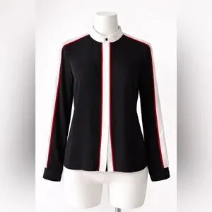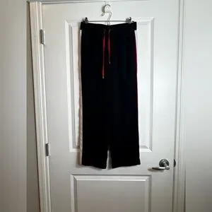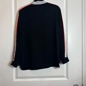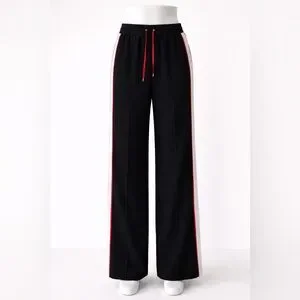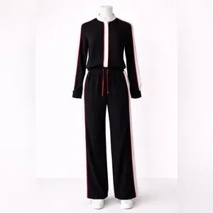 Sporty chic 2-piece athleisure set featuring a sleek black blouse and matching track pants with white side panels and red stripe detailing. Stylish yet comfortable, perfect for casual wear, travel, or elevated lounge looks.