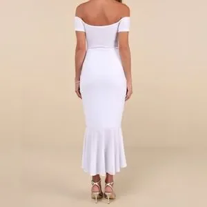 Slip into the Lulus How Much I Care White Velvet Off-the-Shoulder Midi Dress and dance the night away! Soft and stretchy velvet shapes this stunning dress that features a sweetheart neckline (with hidden no-slip strips) and a darted bodice, framed by short off-the-shoulder sleeves. High, fitted waist tops a figure-flattering midi skirt with a trumpet silhouette and a ruffled, high-low hem.