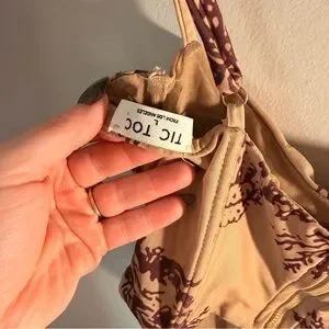 Trendy Tic Toc corset-style bustier top in a beige/tan base with brown abstract print. Features structured cups, adjustable spaghetti straps, and a lace-up front detail that gives it a flattering, fitted silhouette. Back zipper closure for easy wear.