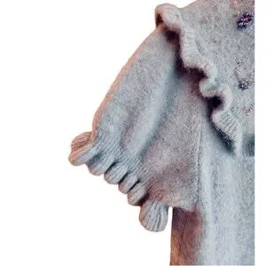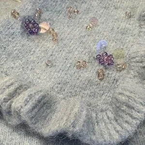 Sweet Zara cropped sweater with a beaded Peter Pan Collar and feminine ruffle trim. Lavender, luminous ivory beads and clear discs form delicate flowers around the front and back collar.