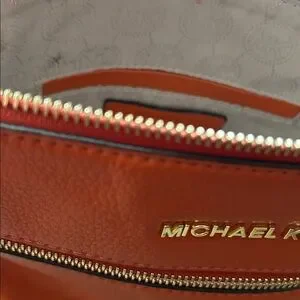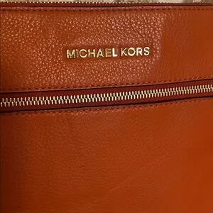 Sleek MICHAEL KORS crossbody in warm orange leather. Gold-tone logo and zipper hardware. Front zip pocket and top zip closure. Adjustable shoulder strap for easy wear. Clean, timeless silhouette for everyday use.