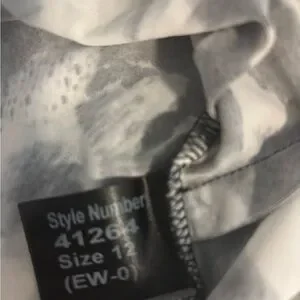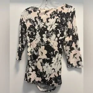Beautiful women's top featuring an abstract black and cream print with tiny sequin dots. Elegant 3/4 sleeves and cowl neck. Perfect for any occasion.