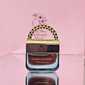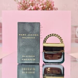 Mini Marc Jacobs Decadence bottle. Glossy black glass with gold-tone hardware and chain handle. Elegant and compact designer fragrance bottle. 4 m L miniature. Perfect for gifting or as an addition to your collection! Bundle to save! ❤️